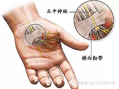 到手掌主要有桡神经,尺神经,正中神经,这些神经从颈椎管出发,穿过关节,韧带,骨纤维管到达手掌末梢,在任何一个部位,神经受到压迫,均会引起手麻。